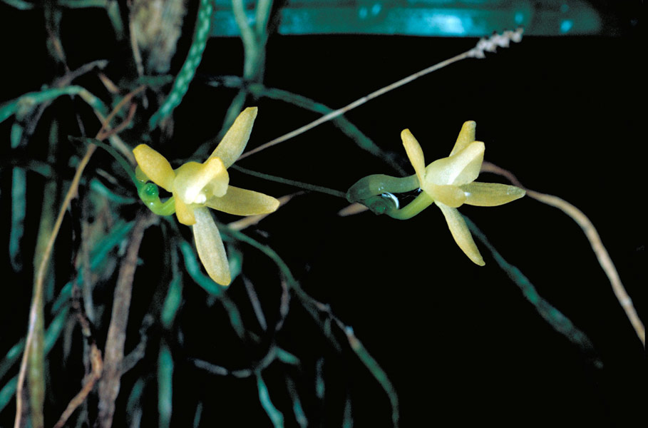 Found from New Guinea, Solomon Island and Queensland Australia as a small, hot growing leafless epiphyte at elevations of 80 to 150 meters on small twigs as a tangled mass that is perched in the upper levels of tall trees where they get bright light and bloom on a horizontal 2" [5 cm] long, several [15] flowered inflorescence with them opening in succession one by one on a extending compressed rhachis with 3 persistant bracts and nonresupinate, ephemeral, nocturnally fragrant flowers all occuring at any time of the year.