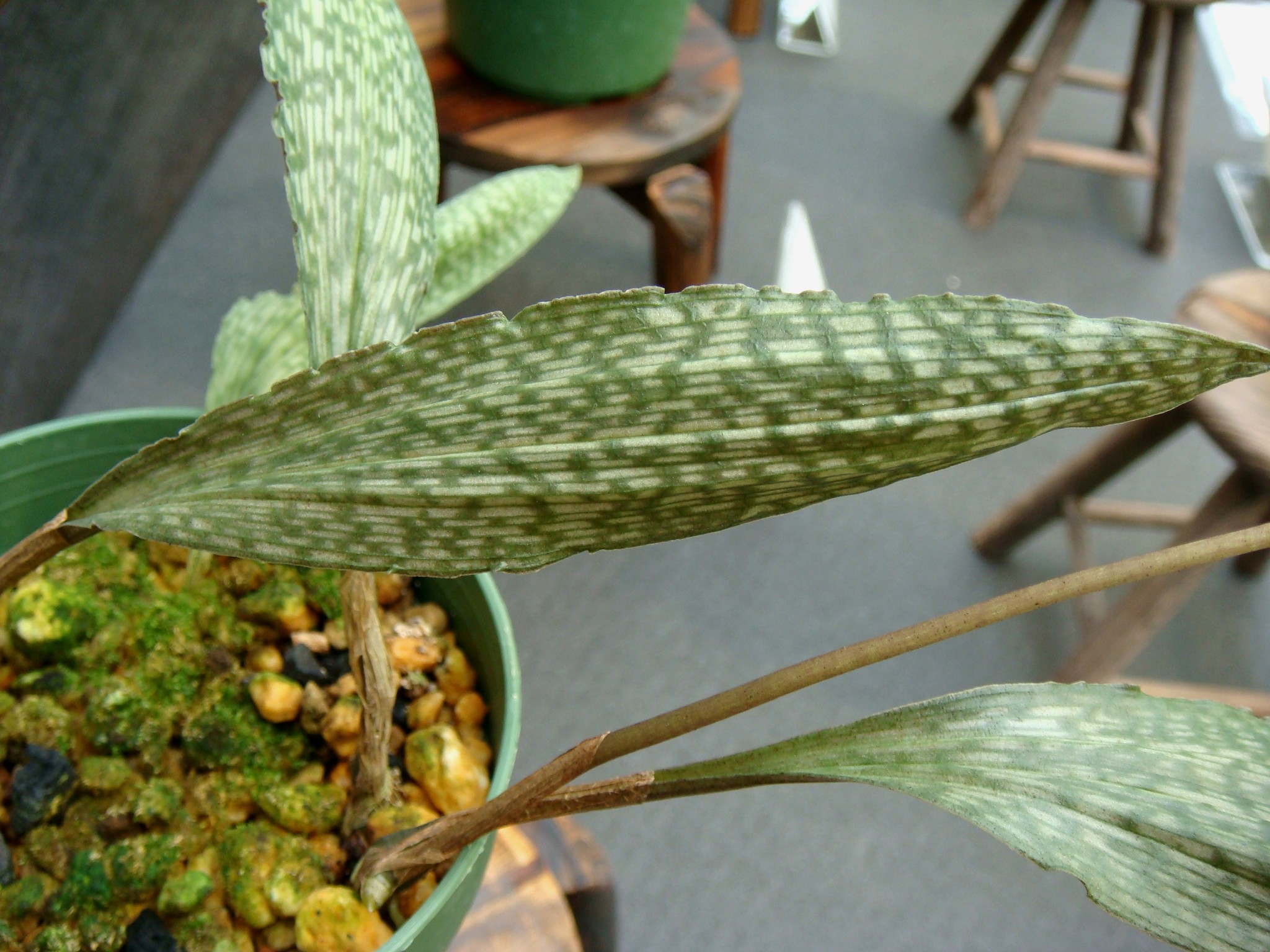 Found in Japan and the Ryukyu islands as a small to medium sized, cool growing terrestrial with inclined, narrowly ovoid, erect to slightly arcuate, pseudobulbs carrying a single, green, plicate, oblong-linear to linear-lanceolate, acute to subacuminate, tapering into a petiolate base leaves with white to silver reticulation above and purple beneath and blooms in the spring on a basal, erect to lateral, 8 to 16" [20-40cm] long few flowered inflorescence