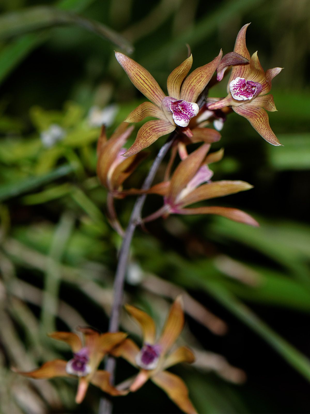 Found in Guangxi, Hainan and Hong Kong Provinces of China as well as northern Vietnam in forests, beside rivers and in bamboo forests in humid, shady locations at elevations of 600 to 900 meters as a medium sized, warm growing terrestrial with closely spaced, dark green to purplish red, ovoid pseudobulbs with 2 sheaths and carrying a single, plicate, dark green, lanceolate, acute, gradually narrowing below into the elongate, petiolate base leaf that blooms in the spring on an erect, glabrous, 12 to 18" [30 to 45 cm] long, 5 to 28 flowered inflorescence with 3 reddish bract-like sheaths below and dark purple, narrowly lanceolate floral bracts.