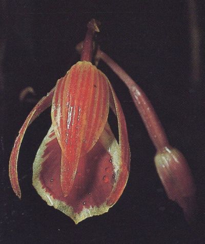 Found in pennisular Malaysia in moss forests at elevations around 1000 to 1250 meters as a small to medium sized, cool growing terrestrial with a short stem carrying a single, erect, ovate, acute, margin somewhat thickened, one margin sometimes crenulate, the other not to slightly crenulate, somewhat fleshy, shining purple brown, plicate, 11 to 15 veined, gradually narrowing below into the crimson petiolate base leaf that blooms in the spring, summer and fall on a terminal, erect, peduncle 5.2 to 9.6" [13 to 24.5 cm] long, with 4 bracts, 7.6 to 10.8" [19 to 27 cm] long overall, rachis 1.28 to 2.24" [3.2 to 5.6 cm] long, 1 to 4 flowered inflorescence with patent, triangular floral bracts and carrying simultaneously opening, pale yellow flowers closely lined with purple and the lip is crison and lined with yellow.
