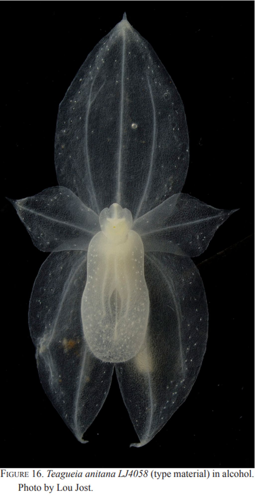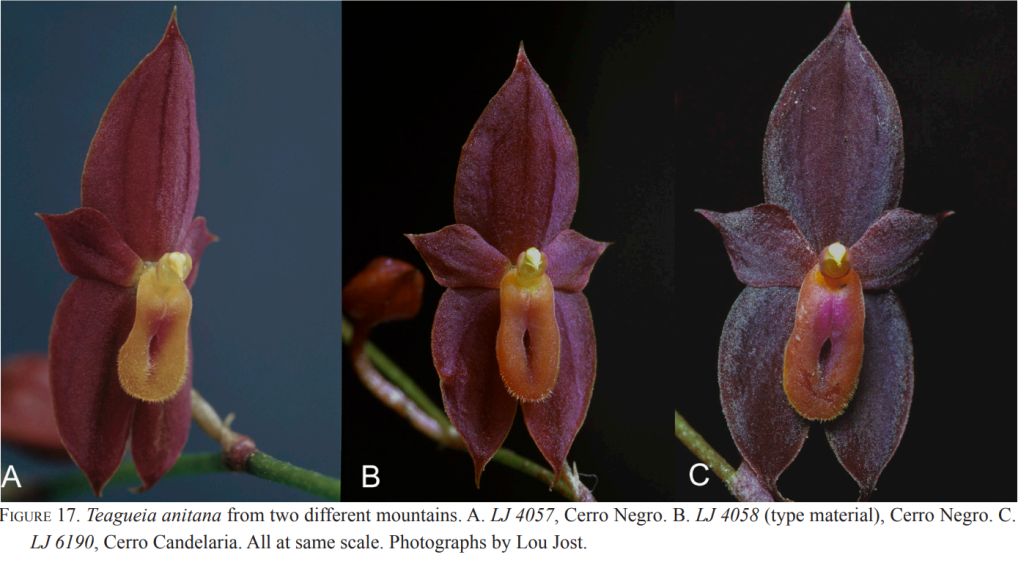 Common Name Anita's Teagueia [Named after Anita Zabludowicz, of London, England who has more than two decades of history supporting philanthropic activities through the Zabludowicz Collection of fine art. Through the World Land Trust, Anita Zabludowicz has helped Fundacion EcoMinga purchase and protect montane cloud forests containing new and endemic orchid species. current]