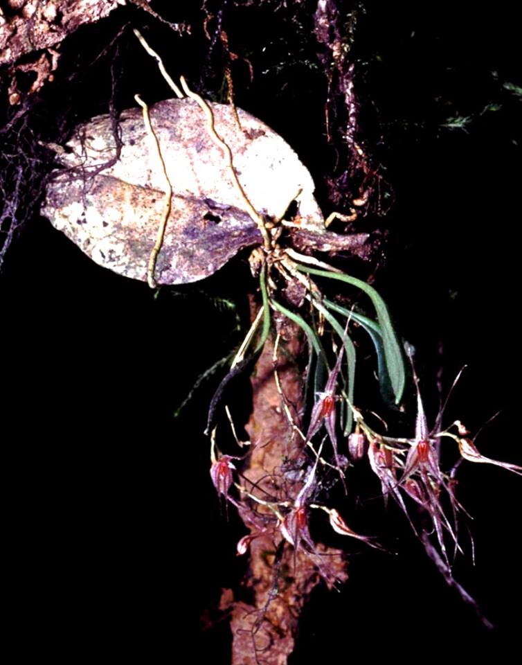 Found in Imbabura Ecuador at elevations around 3000 to 3400 meters as a mini-miniature sized, cold growing epiphyte with erect, slender ramicauls enveloped by 2 to 3, thin, ribbed, imbricate sheaths and carrying a single, apical, erect, coriaceous, elliptical-obovate, obtuse to rounded, cuneate below into the petiolate base leaf that blooms in the spring on a erect, loose, subsecund, to 3.2" [to 8 cm] long including the 1.6" [4 cm] long peduncle, successively 2 to 4, several flowered inflorescence arising laterally from the ramiucal with thin floral bracts.