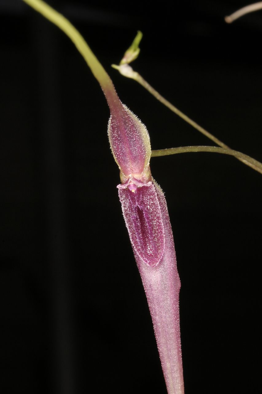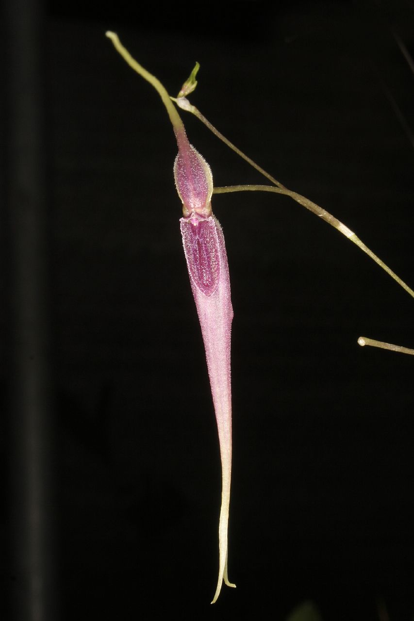 Found in Pastaza province of Ecuador in cloud forests at elevations around 2400 meters as a miniature sized, cold growing epiphyte with erect ramicauls enveloped basally by 2 to 3 thin, ribbed, imbricating sheaths and carrying a single, apical, erect, coriaceous, elliptic-ovate, undulate margins, subacute to obtuse, gradually narrowing below into the elongate, cuneate, petiolate base leaf that blooms in the winter on an erect to suberect, distantly, successively few flowered, 3.2 to 5.2" [8 to 13 cm] long including the 2 to 2.8" [5 to 7 cm] long peduncle, racemose inflorescence arising laterally from the ramicaul with thin floral bracts.