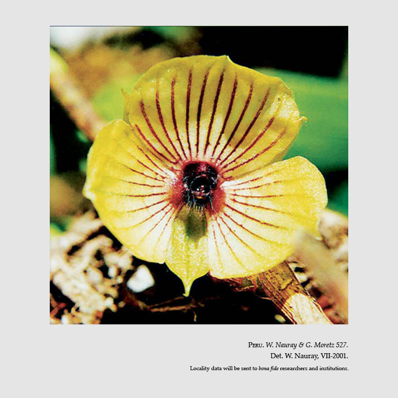 Found in the Valles de Lares in the eastern side of the department of Cuzco Peru in cloud forests at elevations around 2500 to 3400 meters as a miniature to just small sized, cold growing, caespitose epiphyte with a stem carrying a few oblanceolate, acuminate leaves with crenulate margins that blooms in the summer through winter on a 4.8" " [12 cm] long, alatae, flexuose racemose, successively 2 to 3, to 9 flowered inflorescence with an ovate-triangular, acuminate floral bracts.