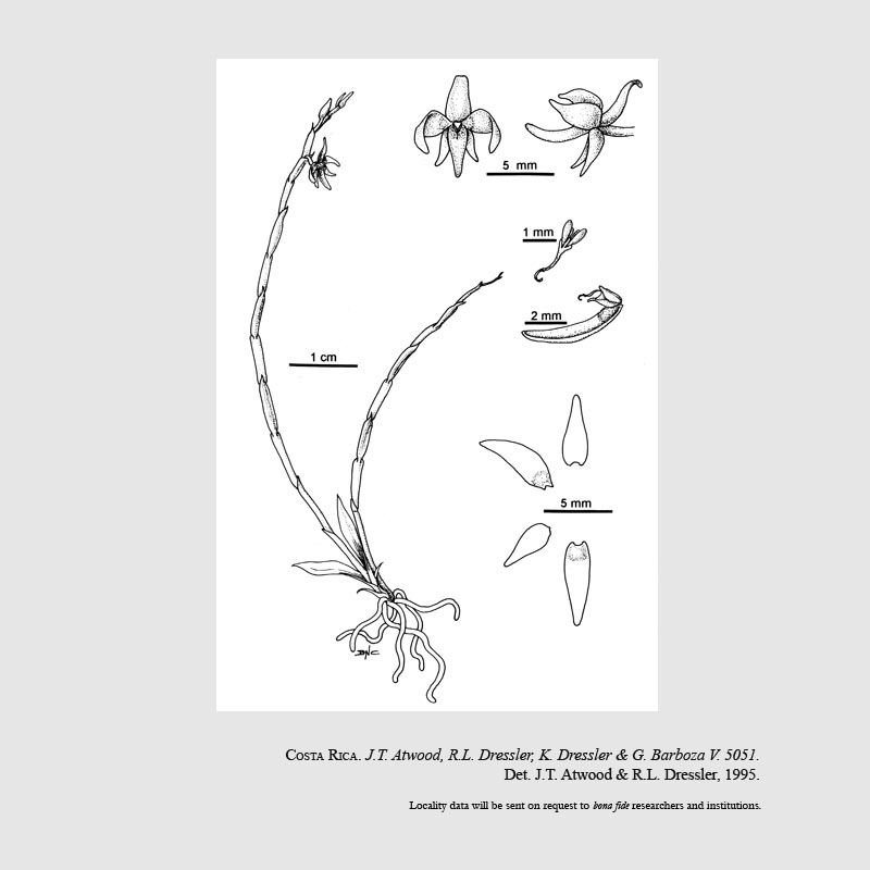 Found in the province of Puntaarenas Costa Rica in lower montane forests at elevations around 1500 to 1600 meters as a mini-miniature sized, cool growing epiphyte with ephemeral, 2 elliptic-lanceolate, acute leaves that blooms in the spring on 1 to 2, wiry, 3.2" [8 cm] long, successively single few flowered inflorescence enveloped almost completely by broadened bracts.