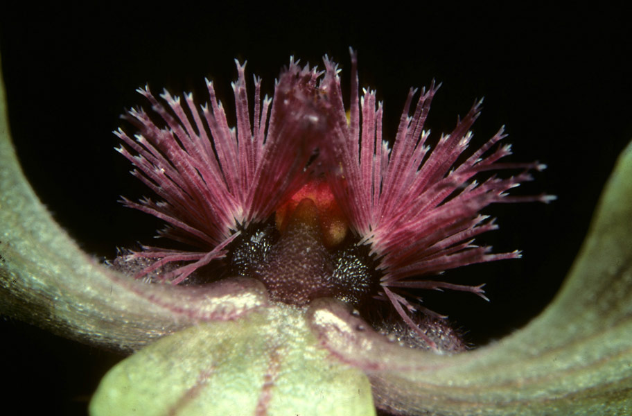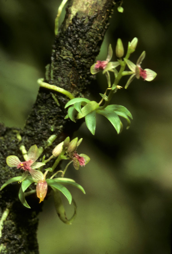 Found in northern Venezuela on small branches in fairly light forests at elevations around 1800 meters as a mini-miniature sized, cool growing epiphyte with a short stem enveloped by imbricating leaf bases and carrying, fleshy, linear, acute, gradually conduplicate below into the base leaves that blooms in the spring on an axillary, erect, to .8" [2 cm] long, successively few flowered inflorescence with small fleshy floral bracts.