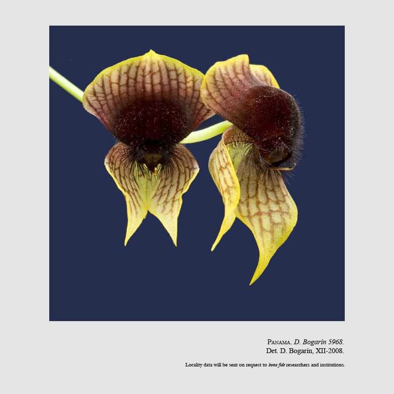 Found in Chiriqui Panama at elevations around 2300 meters as a mini-miniature sized, cold growing epiphyte with a very short stem enveloped by leaf sheaths carrying 2 to 3, broadly elliptic-oblong, acute leaves that blooms in the late fall through early spring on a terminal or axillary, .8 to 4.4" [ 2 to 11 cm] long, racemose, simultaneously 2 to 4 flowered inflorescence with ovate, acuminate floral bracts carrying non-resupinate, simultaneously opening flowers