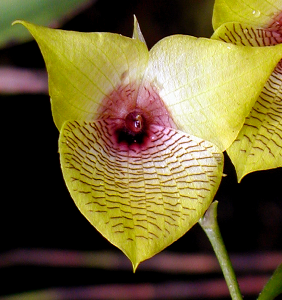 Found in Peru and Bolivia in cool wet, montane cloud forests at elevations around 1800 meters as a mini-miniature sized, cool growing epiphyte with an ascending rhizome carrying elliptic-oblong, acute, conduplicate leaves that blooms in the late fall and winter on a terete, slender, erect, 3 to 5 flowered inflorescence