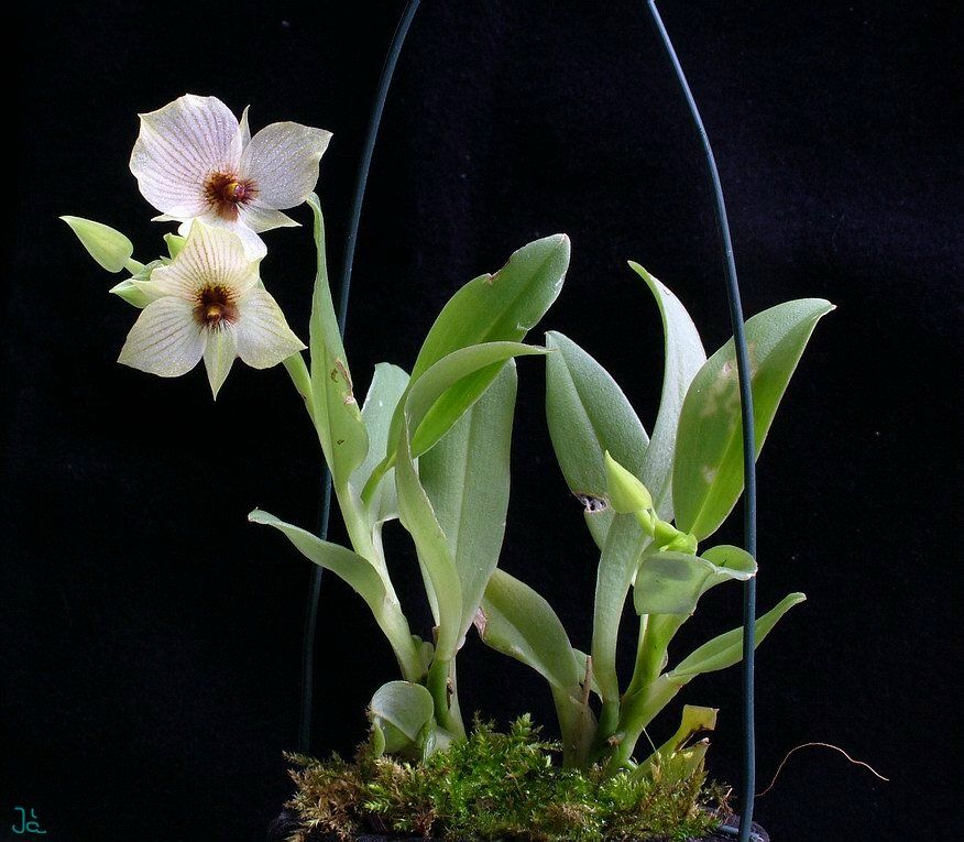 Found in Peru in cold moist cloud forests at elevations around 3000 meters as a miniature sized, cold growing epiphyte with elongate, slightly compressed stems carrying narrowly oval to oblanceolate, acute leaves that blooms at most any time of the year on an axillary, racemose, successively few flowered inflorescence with 1 to 2 flowers open at any one time.