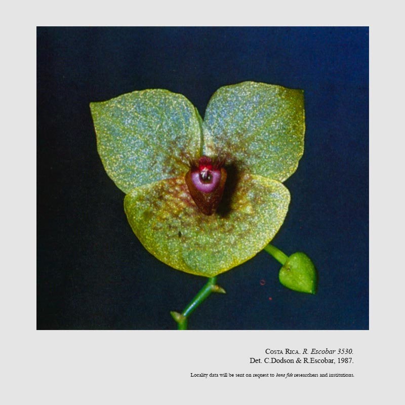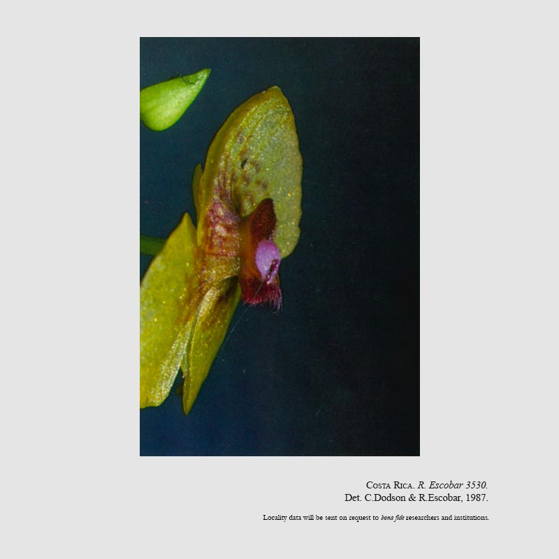 Found in Costa Rica at elevations around 1700 meters as a mini-miniature sized, cool growing epiphyte with a stem enveloped by imbricate leaf bases and carrying 3 to 5, alternate, distichous, net like reticulated, obovate-elliptic, acute at the apex, narrowing at the base to unite with the sheath leaves that blooms in the fall on a terminal, unbranched, terete, to 3.2" [8 cm] long, successively single to 3 flowered inflorescence with triangular-ovate floral bracts.