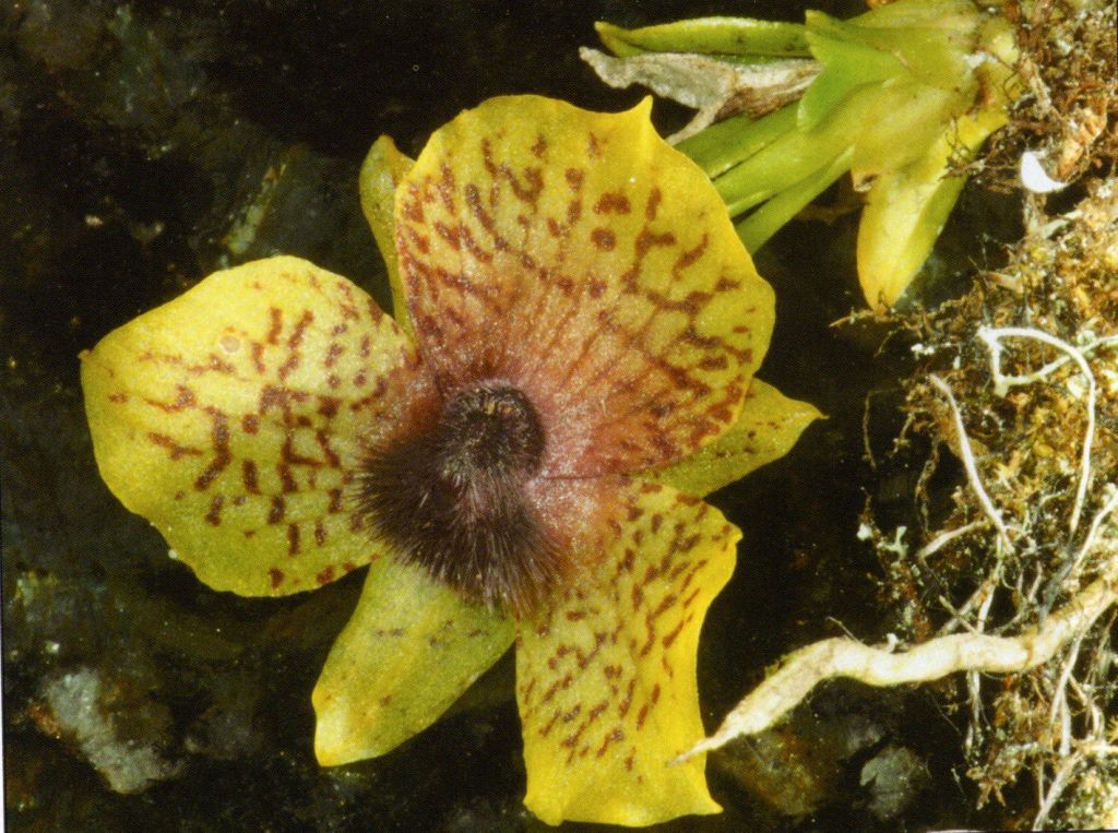 Found in Cundinamarca department of Colombia in cloud forests around Chingaza at elevations around 3400 meters as a mini-miniature sized, cold growing epiphyte with an abbreviated stem carrying a few leaves that blooms in the fall on an axillary, longer than the leaf, peduncle flattened, provided with 2 bracts of differing sizes, to 2.5" [6.5 cm] long, single flowered inflorescence.