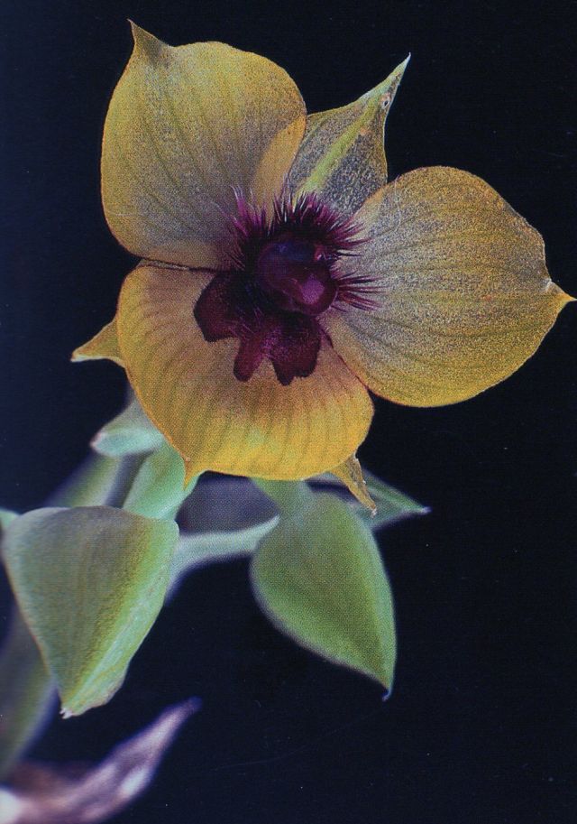 Found in Napo department of Ecuador in wet montane forests at elevations of 2300 to 2500 meters as a mini-miniature sized, cold growing epiphyte with a short, basally branching stem enveloped compleletly by distichous, imbricating leaf sheaths carrying narrowly obovate, acute, apiculate, narrrwoing below intothe articulated junction with the sheath leaves that blooms in the lateer spring through summer on a terminal or lateral from near the apex of the stem, peduncle to 4" [10 cm] long, flattened, 3 winged, to 6" [15 cm] long, successively single, several flowered inflorescence with ovate, boat shaped, keeled on the back floral bracts and carrying yellow flowers with red brown vein lines, a red-black call and the column and the spines red brown.