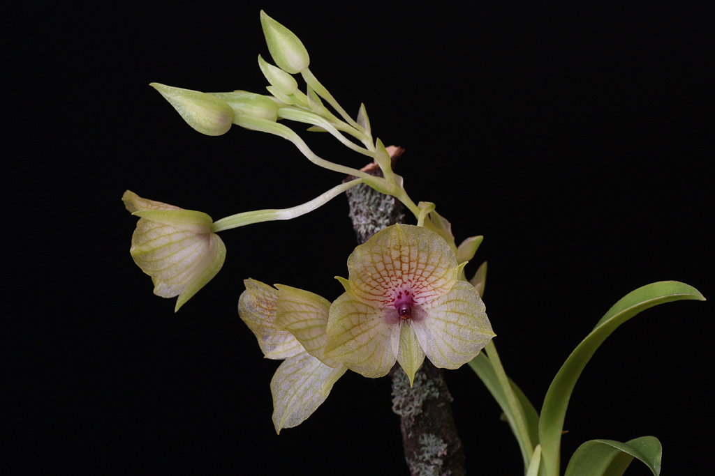 Found in Piura department of Peru in cold damp cloud forests at elevations around 3150 meters as a mini-miniature sized, cold growing epiphyte with short stem enveloped by imbricating leaf sheaths and carrying 4 to 5, coriaceous, oblong-elliptic, acute, gradually narrowing into the conduplicate, subpetiolate base leaves that blooms in the late winter and early spring on an axillary, short-pedunculate, compressed, to 3.8" [9.5 cm] long, successively 3 to 4 flowered inflorescence with ovate, acute-acuminate floral bracts.