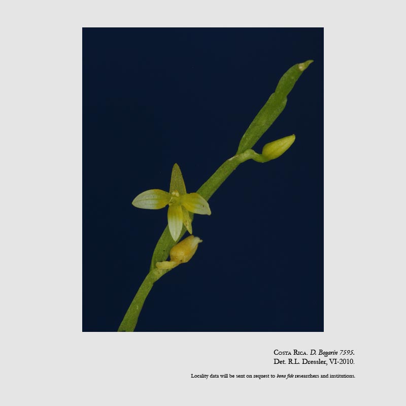 Found in Panama at elevations of 1000 to 1450 meters as a miniature sized, warm to cool growing epiphyte with an elongate stem to 4.8" [12 cm] long, carrying ephemeral, thin, oblong leaves that blooms in the late summer and early fall on an erect inflorescence with triangular, decurrent on the rachis, floral bracts.