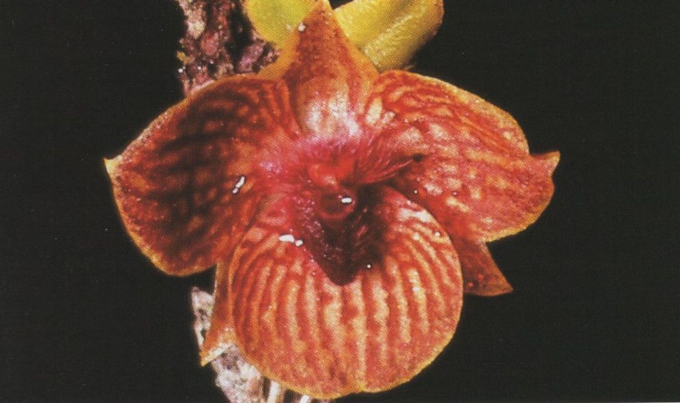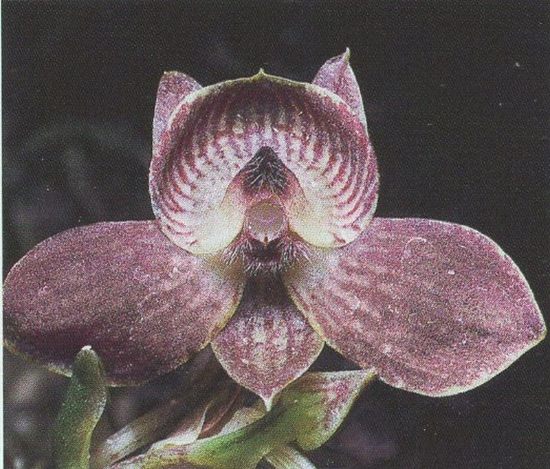 Found in southern Ecuador in upper montane cloud forests at elevations around 1400 to 3000 meters as a mini-miniature sized, cool to cold growing epiphyte with a very short stem enveloped by imbricate leaf sheaths and carrying coriaceous, narrowly elliptic, acute, gradually narrowing below into the conduplicate base leaves that blooms at most any time of the year on a terminal, winged, to 3.2" [8 cm] long, successively single flowered inflorescence with ovate, slightly inflated floral bracts.