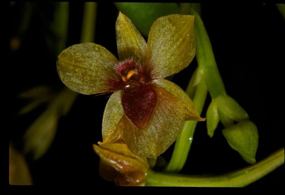 Found in Napo Ecuador in wet montane cloud forests at elevations around 2040 meters as a mini-miniature sized, cold growing epiphyte with a short, basally branching stem carrying narrowly obovate, acute, narrowing below into the articulate junctioned base leaves that blooms in the winter on a terminal or lateral, to 3.2" [to 8 cm] long, 3 winged, successively few, single flowered inflorescence with boat-shaped, ovate, keeled on the back floral bracts and carrying non-resupinate flowers