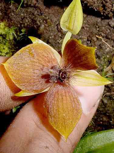 Found in Imbabura and Pichincha provinces of Ecuador at elevations of 2100 to 2500 meters as a mini-miniature sized, cold growing, caespitose epiphyte with a short stem enveloped completely by distichous, imbricate sheaths carrying narrowly obovate, obtuse, apiculate, narrowing below into the base leaves that blooms in the late spring, late summer and late fall on a terminal or near the apex in the leaf axils, erect, peduncle to 5.2" [13 cm] long, winged, to 8" [20 cm] long overall, successively single, few flowered inflorescence with ovae, carinate beneath, shorter than the pedicel, boat-shaped floral bracts