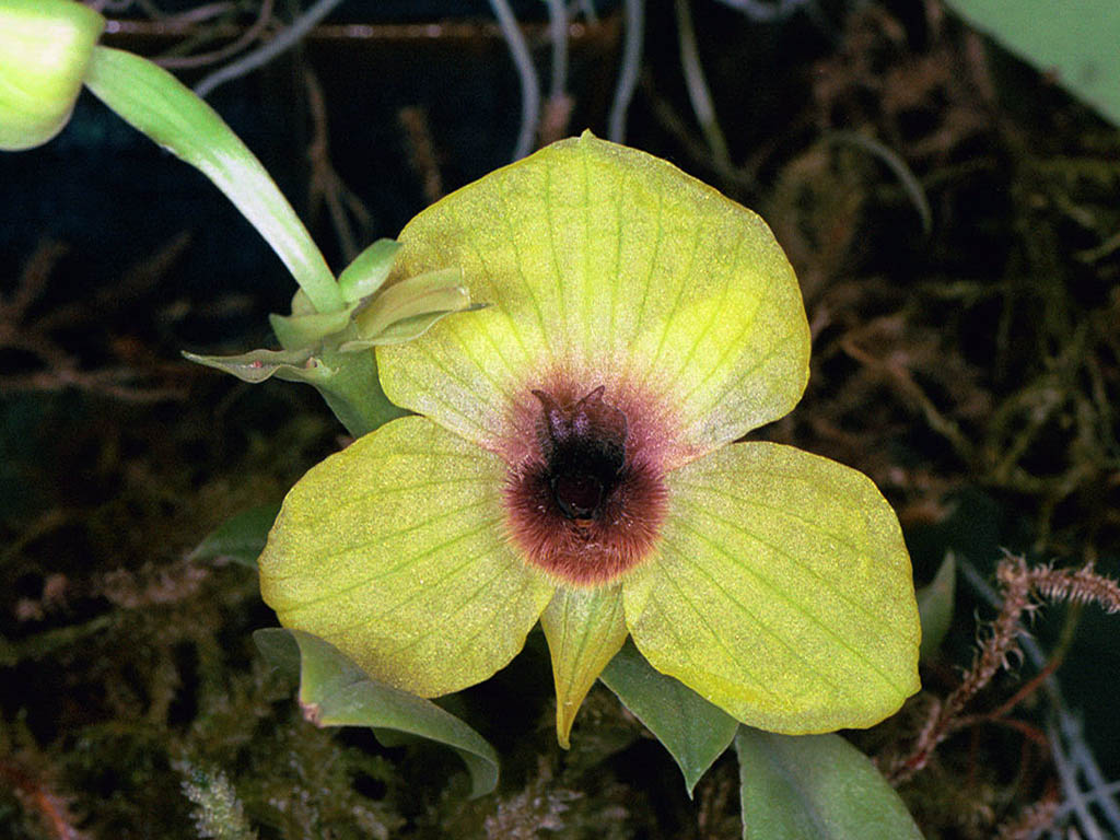 Found in Ecuador and Peru at elevations of 2700 to 3250 meters in cold, wet cloud forests as a mini-miniature sized, cold growing epiphyte with a short stem enveloped by several, imbricating basally clasping leaf-bearing sheaths and terminating in an elliptoid pseudobulb carrying a single, apical erect, oblong-lanceolate, acute, conduplicate below into the base leaf that blooms in the fall through spring on and erect, basal, axillary, 2.4" [6 cm] long, successively, 5 to 6 flowered, angular inflorescence