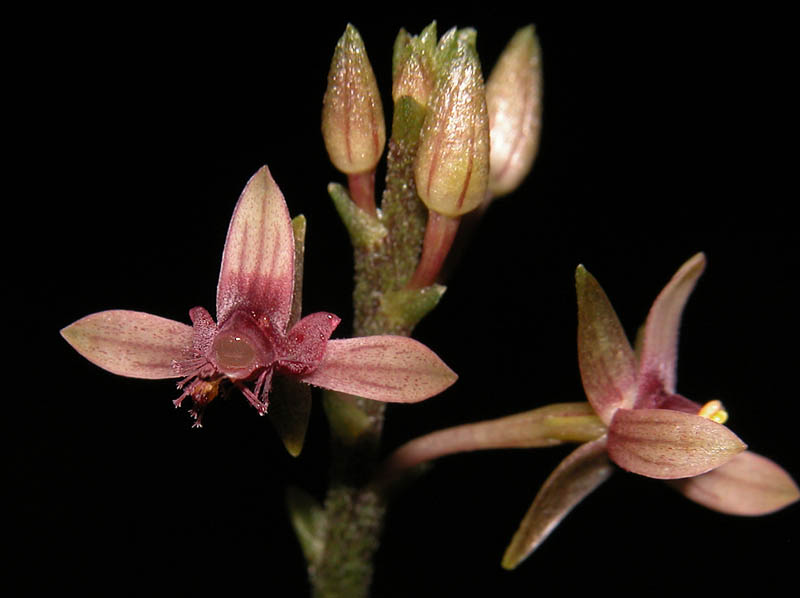Found in Pastaza province of Ecuador at elevations of 1350 to 2800 meters as a mini-miniature sized, cool to cold growing epiphyte with a stem enveloped by imbricate leaf sheaths carrying distichous, fan-shaped, narrowly elliptic, acute leaves that blooms in the fall on a terminal, erect, racemose, terete, to 6" [15 cm] long, successively single, several flowered inflorescence.