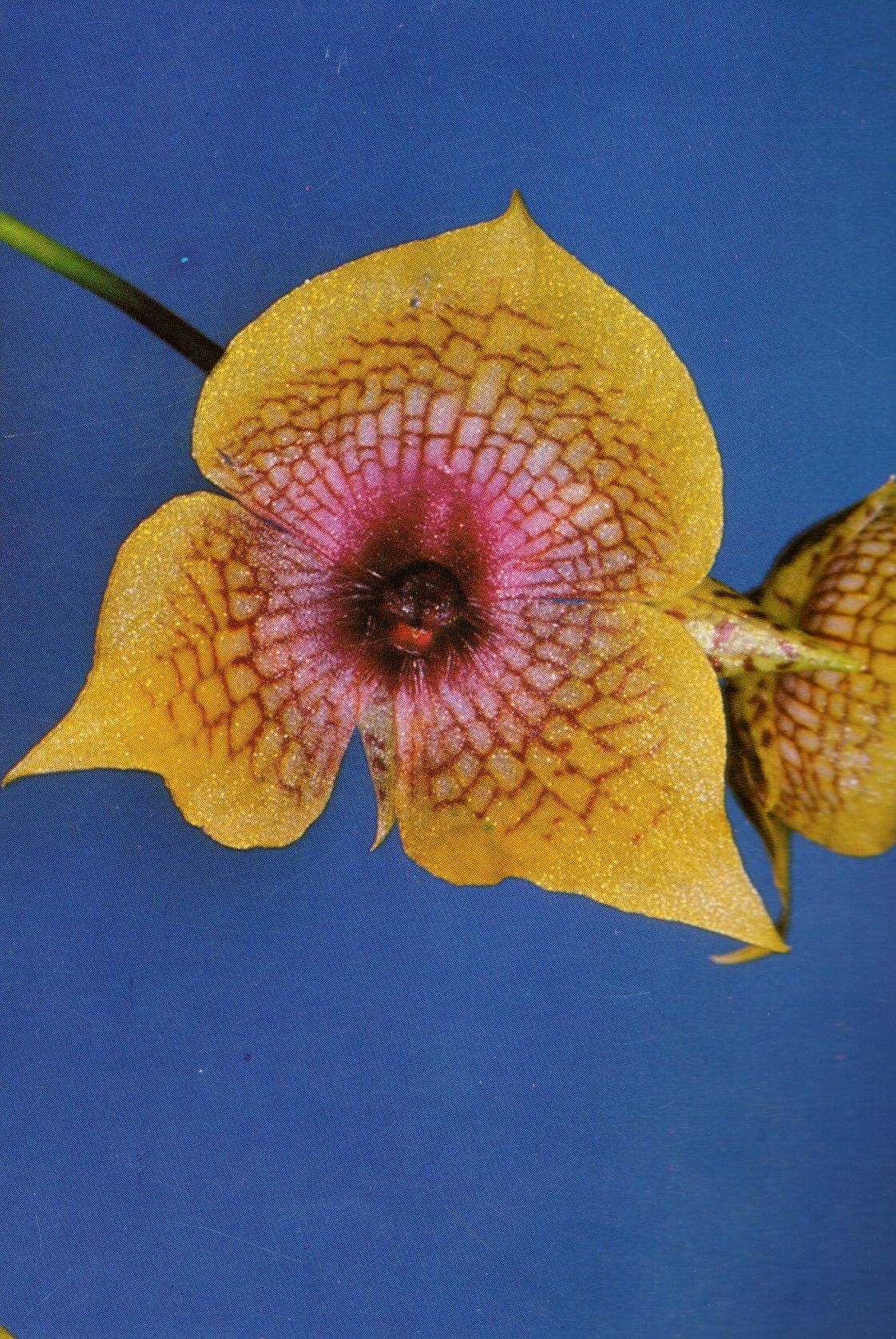Found in Costa Rica in pluvial and oak forests at elevations of 2400 to 3300 meters as a mini-mniniature sized, cold growing epiphyte with erect stems carrying oblanceolate leaves that blooms in the spring, summer and fall on a terminal, 1.6 to 5.2" [4 to 13 cm] long, 3 to 5 flowered inflorescence.
