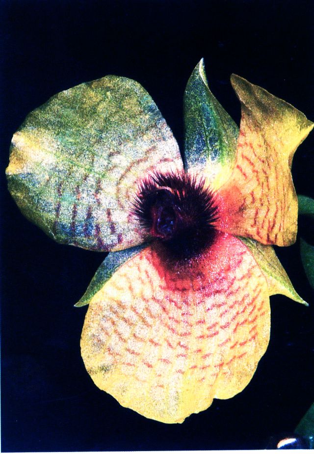 Found in Loja province of Ecuador at elevations around 2500 meters as a miniature to small sized, cold growing epiphyte with a short rhizome giving rise to small flattened pseudobulbs enveloped by 2 to 3 leaves and carrying a single, apical, thick, elliptic-oblong, obtuse, dehiscent at the base leaf that blooms on a triangular peduncle, 2.4 to 3.2" [6 to 8 cm] long, rachis short, few flowered inflorescence with navicular, acute floral bracts