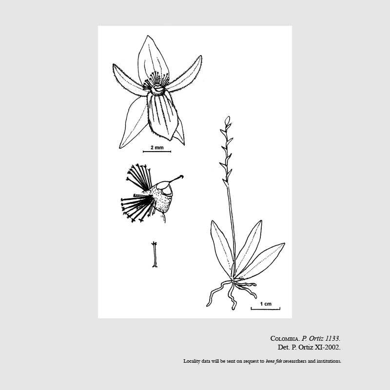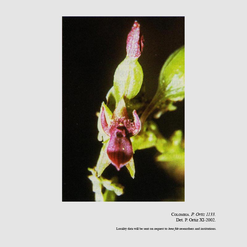 Found in Boyaca' department of Colombia at elevations around 2300 meters as a mini-miniature sized, cold growing epiphyte with a very abbreviated stem carrying basal, elliptic, acute, gradually narrowing below into the base leaves that blooms in the summer on a terminal, erect, terete, to 3.2" [8 cm] long, successively few flowered inflorescence.