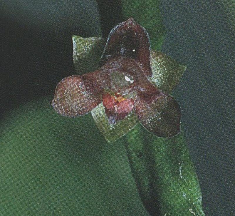 Found in Dominican Republic and Haiti in wet montane broadleafed forests on trees overhanging rivers at elevations around 1200 to 1250 meters as a mini-miniature sized, cool growing epiphyte with a rhizomatous, short stem envveloped by persistent leaf bases and carrying 1 to 2, coriaceous, elliptic, cuspidate, acute leaves that blooms in the late summer and early fall on an erect, ancipitous, triquetrous, peduncle with abruptly divergent, ovate, acute bracts, to .2" [5 mm] long overall, sparsely 2 to 4 flowered inflorescence with abruptly divergent, ovate, acute floral bracts