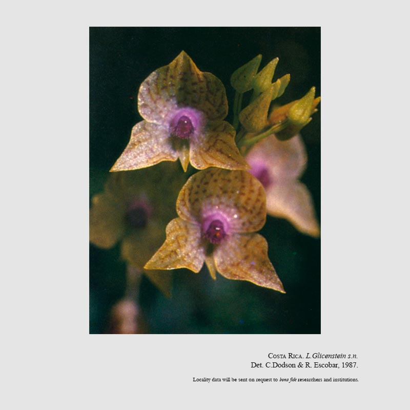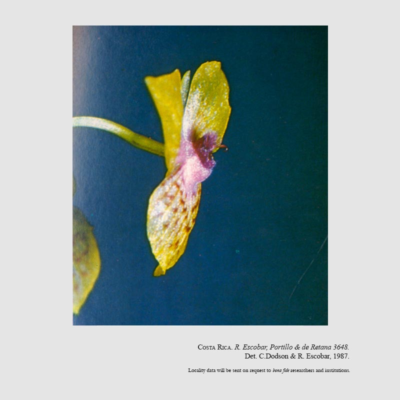References W3 Tropicos, Kew Monocot list , IPNI ; *Orquideología Vol 17 #2 pg 109. 1987 Dodson & Escobar drawing/photo fide; Manual de Plantas de Costa Rica Vol 3 Hammel, Grayum, Herrera and Zamora 2003;