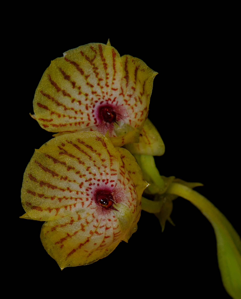 Found in Imbabura province of Ecuador at elevations around 3300 to 3400 meters as a mini-miniature sized, cold growing epiphyte with a flattened stem enveloped by imbricate leaf sheaths and carrying coriaceous, narrowly obovate, apiculate, gradually narrowing below into the conduplicate base leaves that blooms in the summer on a terminal to lateral, terete, racemose, peduncle to 1" [2.5 cm] long, 1 internode, to .8" [2 cm] long, successively single, flowered inflorescence with ovate-triangular floral bracts.