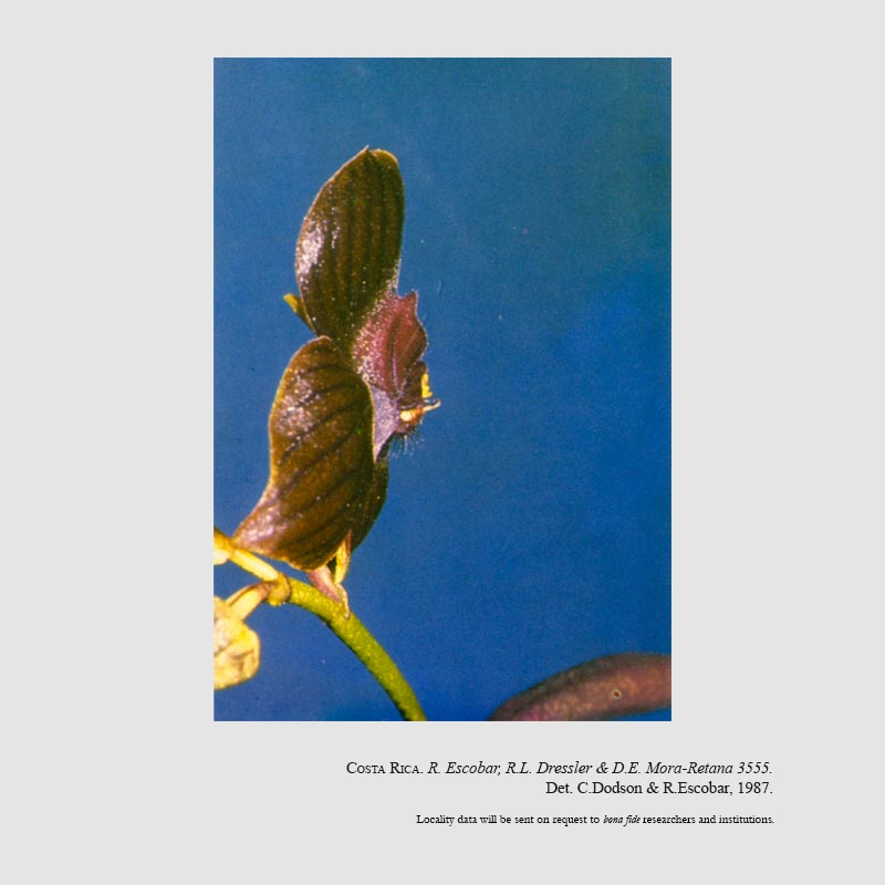 References W3 Tropicos, Kew Monocot list , IPNI ; *Orquideología Vol 17 #2 pg 114. 1987 Dodson & Escobar drawing/photo fide; Manual de Plantas de Costa Rica Vol 3 Hammel, Grayum, Herrera and Zamora 2003;