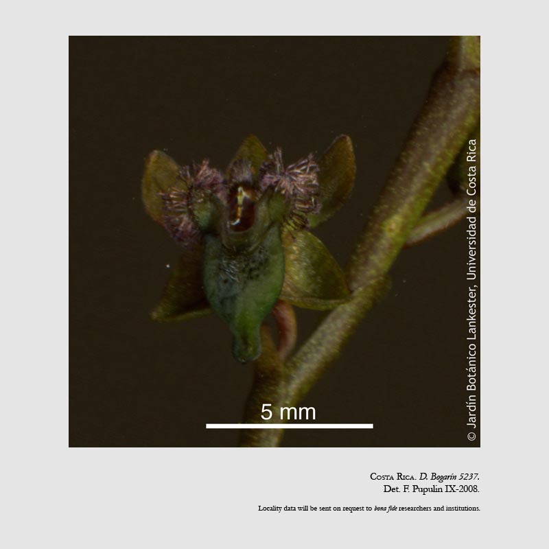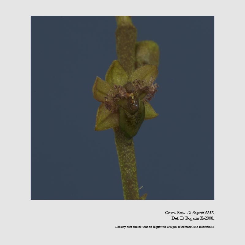 Found in Costa Rica on shady lower thin branches on mossy trees in wet montane oak forests at elevations around 2400 meters as a cold growing epiphyte with an abbreviated stem carrying 3 to 4, distichous, narrowly elliptic to lanceolate, acute, minutely apiculate leaves that may or may not be present at blooming occuring in the winter on a mostly simple racemose, with successive secondary branches, terete, 2 to 4.6" [5 to 9 cm] long, flattened, successively 1 to 3, many flowered inflorescence with triangular, acute floral bracts.
