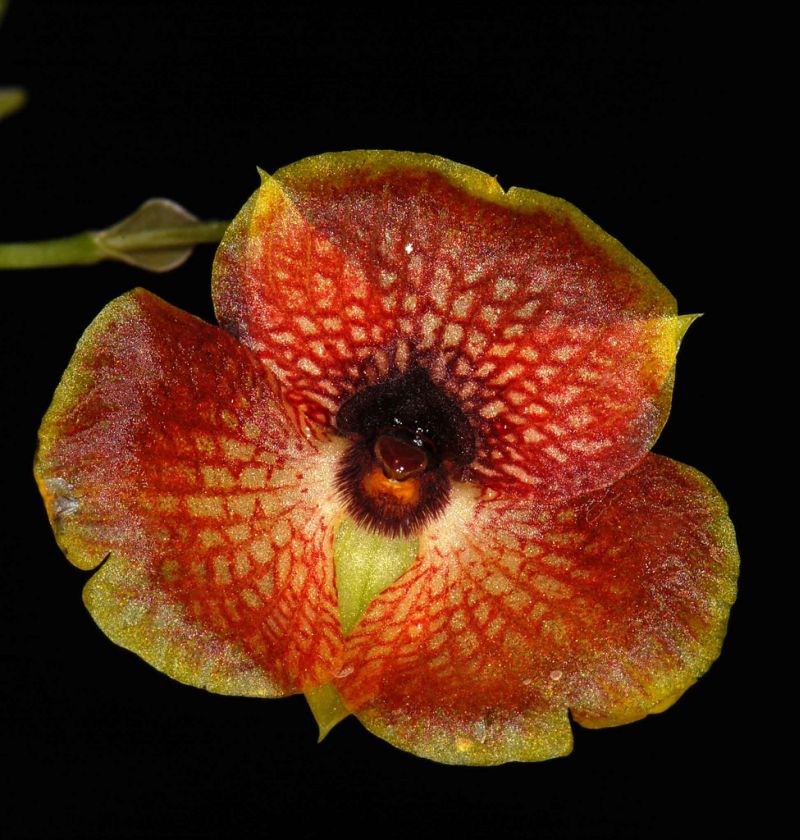 Found in Ecuador and Peru in upper montane cloud forests at elevations of 2500 meters as a miniature sized, cold growing epiphyte that dies back after blooming and takes a rest until the next growth season so do not throw away until you are sure that it is dead. with a short stem and flattened pseudobulb enveloped completely by distichous, imbricating sheaths carrying a single, apical, narrowly obovate, acute, apiculate leaf that gradually narrows towards the base and is articulated to the leaf sheath. This speecies blooms at any time of the year on a flattened, 4" [10 cm] long, successively singl [sometimes 2] flowered inflorescence with ovate, congested, concave, boat-shaped floral bracts