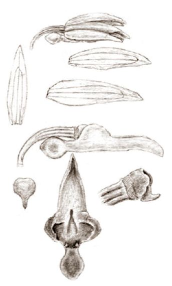 Found in Papua New Guinea in lowland forest as a small sized, hot growing epiphyte with a very short leafless stem giving rise to numerous, elongated, linear, flattened, 12" {30 cm] longroots that blooms in the winter on many, erect, peduncle filiform, glabrous 1.2 to 1.48" [3 to 3.7 cm] long, at about one third above the base with a small, short, tubular, obtuse, apiculate scale, rachis probably short, with short, glabrous internodes, to 8 flowered inflorescence with distichous, patent, overlapping, clasping the rachis, broadly ovate-triangular, acuminate, acute, concave floral bracts and carrying small, somewhat fleshy flowers.