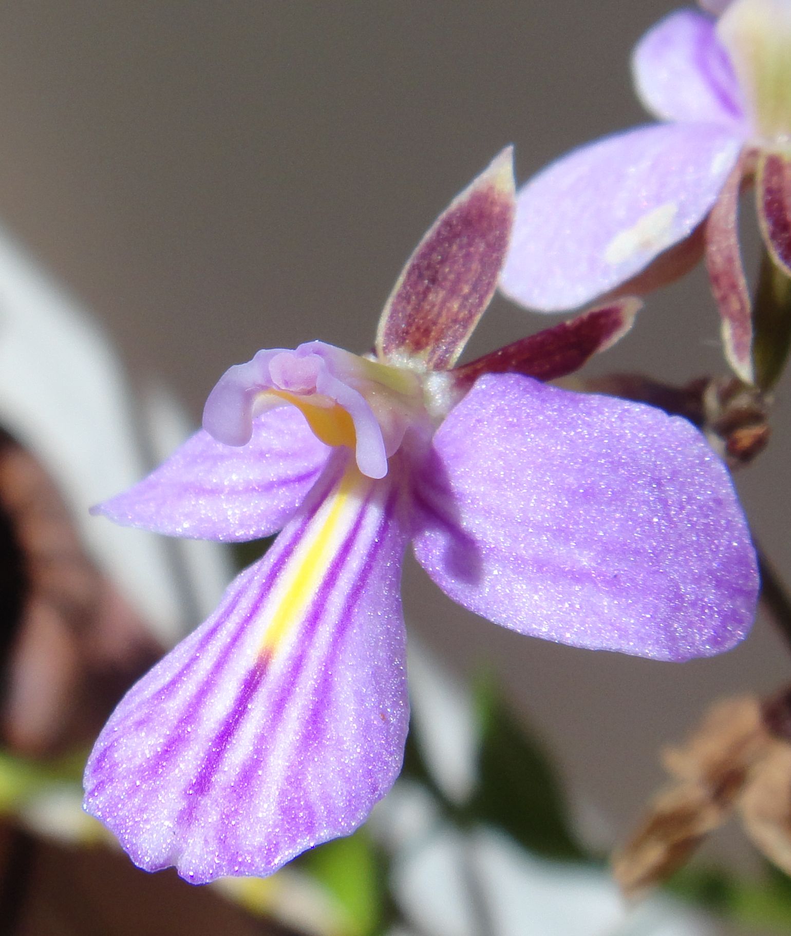CAUTION Many references including Kew place this species as synonomous with T canaliculata. The flowers of T elegans differ from T canaliculata by having the central yellow line on the lip which T canaliculata does not have, the plants also differ with T elegans in not being so vigorous and does not have as long a rhizome between growths. I grow mine in very bright sun [3 to 5 hours of direct sun in summer], and have high on the bench where it gets less water, I fertilize weekly year round. The inflorescence begin to arise in late Febuary to March and flowering begins in Key West in May and continues through late summer.