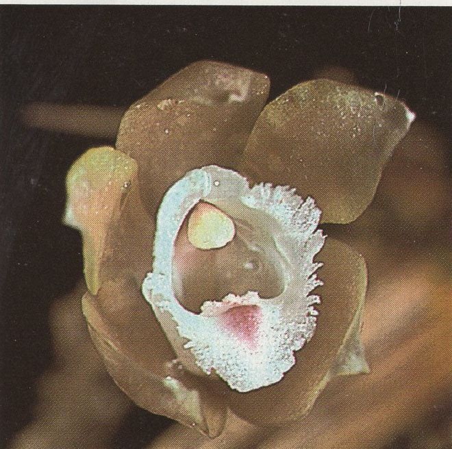 Found in Costa Rica in rainforests at elevations around 850 meters as a medium sized, hot growing, caespitose epiphyte with conical to ovate, longitudinaly sulcate pseudobulbs partially enveloped below in youth by imbricating sheaths becoming fibrous with age, carrying a single, apical, plicate, elliptic-lanceolate, acute, gradually narrowing below into the conduplicate, terete, petiolate base leaf that blooms in the fall on an erect, slender, 2" [5 cm] long, single flowered inflorescence with non-resupinate flowers