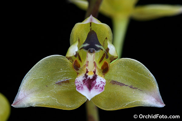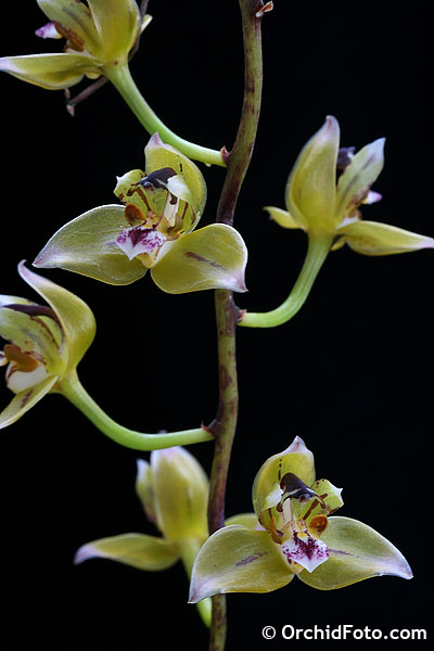 Found in Thailand, Malaysia, Vietnam and Borneo in lowlands and lower montane forests at elevations of 600 to 700 meters as a small sized, hot growing terrestrial or epiphyte on trees on steep granite slopes of stream valleys with flattened pseudobulbs carrying a single, apical, narrowly elliptic to oblong-elliptic leaves and blooms in the fall on a 5" [12.5 cm] long, 10 flowered inflorescence