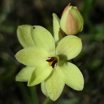 Found in Western Victoria, Tasmania, South Australia and Western Australia at elevations of sea level to 400 meters in shrubby to heathy areas growing in clay with wet winters and grows into large colonies in full sun with a slender, wiry, flexuous, pinkish stem with 2 bracts situated at the points of flexation and carrying a single, terete, channeled leaf that blooms in the winter and spring in nature on an erect, 10" [25 cm] long, 1 to 4 flowered inflorescence with lemon to rose scented flowers.