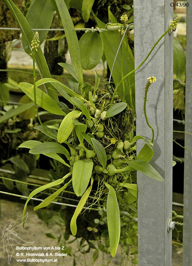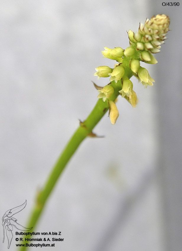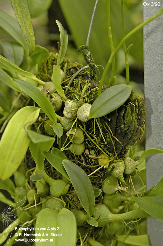 Found in penninsular Malaysia, Java, Sumatra, Borneo, The Philippines and Christmas Island in hill and lower montane forests at elevations of 500 to 1600 meters as a miniature sized, hot to warm growing epiphyte on tree trunks or as a lithophyte on rocks with hershey kiss-like, light green, obtusely angular pseudobulbs enveloped almost completely by a from the base small, leaf-like sheath and carrying a single, apical, narrowly lanceolate, obtuse leaves and blooms in the fall, winter and spring on a basal, erect, 4.2" to 12" [11 to 30 cm] long, terete, densely many flowered inflorescence with shortly triangular, concave and acute floral bracts carrying the scarcely opening flowers in an apical conical head.