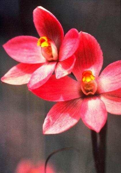 Found in New South Wales, Victoria, Tasmania and South Australia st elevations of sea level to 800 meters as a small to medium sized, cold growing terrestrial in heavy timber and loam with subterranean tubers giving rise to a slender, red tinted, flexuous stem carrying a single, apical, glabrous, linear, terete or channeled leaf basally tinged with red that blooms in the spring in nature on a terminal, tall, erect, raqchis 4" [10 cm] long, wiry, fractiflex, 1 to 4 flowered inflorescence carrying pink, red or yellow flowers.