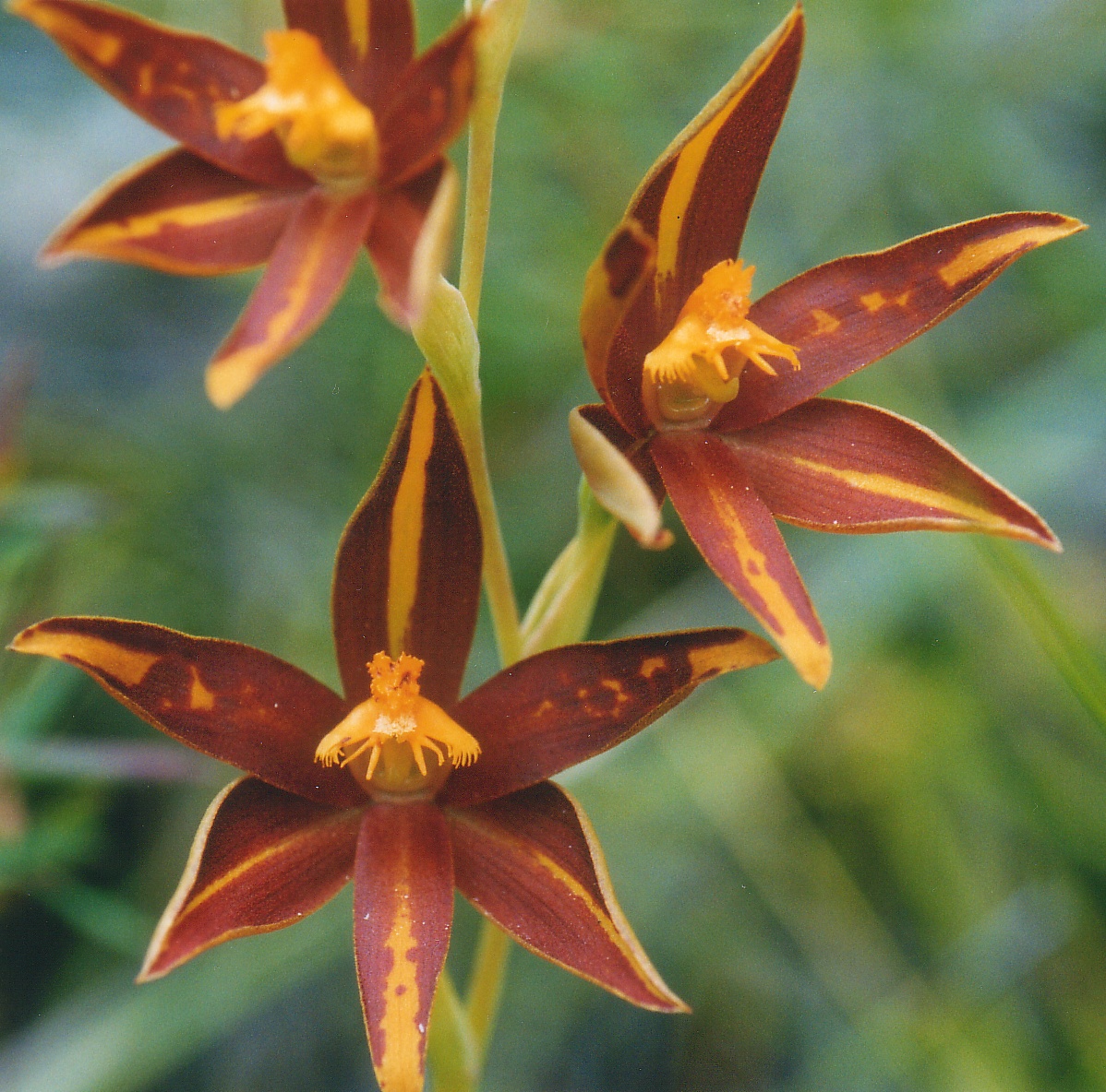 Found in southwest Western Australia at elevations of 50 to 80 meters in winter wet areas among shrubs as a small to medium sized, cold growing terrestrial with a single leaf that blooms in the late spring and early summer on an erect, 6 to 10" [15 to 25 cm] long, 2 to 12 flowered inflorescence with several small bracts.