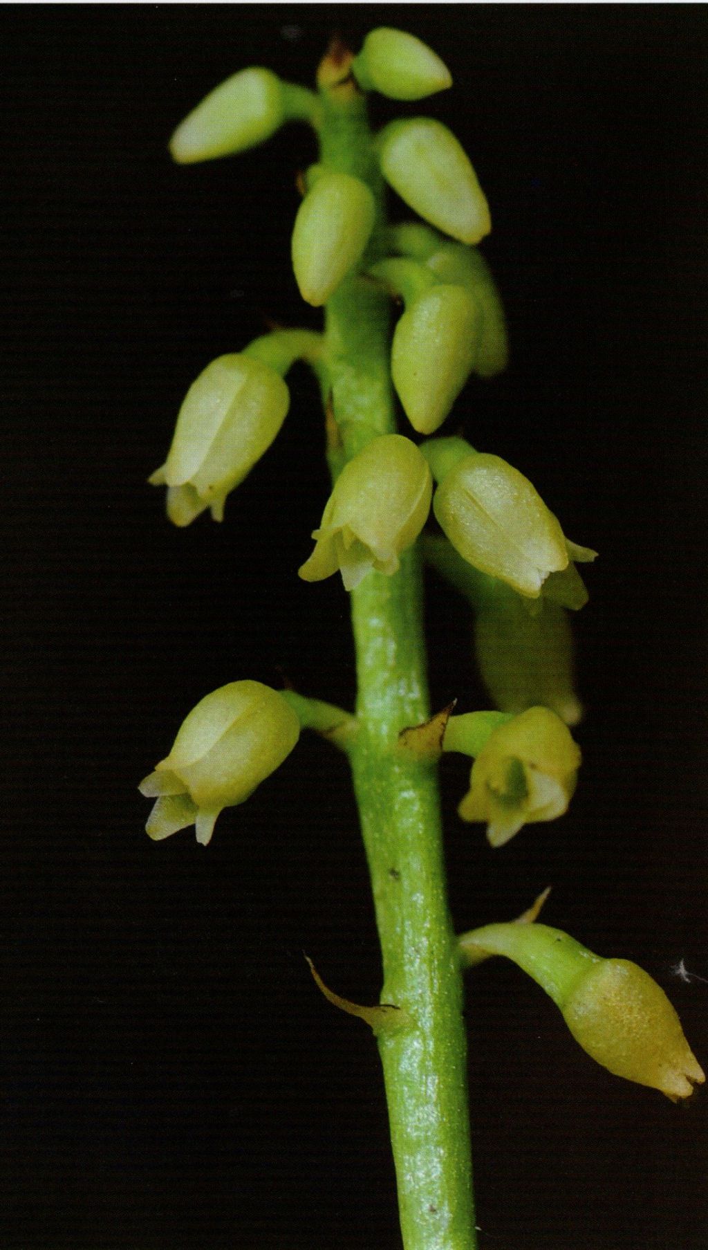 Found in the Chinese Himalayas, Assam, Thailand and Vietnam at elevations around 1000 to 1500 meters as a mini-miniature to miniature sized, cool growing terrestrial with obturbinate to depressed globose pseudobulbs carrying a single, apical, erect, spathulate, obtuse, gradually narrowing below into the conduplicate, petiolate base leaf that blooms in the later summer on a basal, erect, flexuous, peduncle 6 to 8" [15 to 20 cm] long, rachis 1.6 to 2" [4 to 5 cm] long, several to many flowered inflorescence with broadly ovate to ovate-lanceolate, acute, as long as the ovary floral bracts and carrying