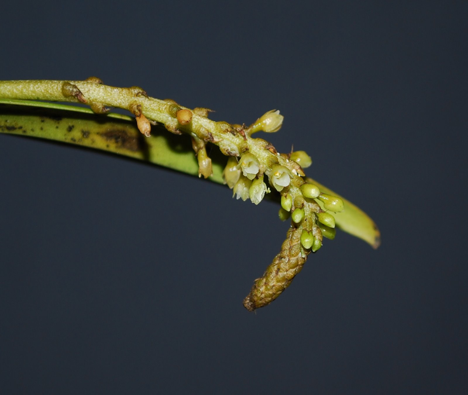 Found in western Sumatra at elevations around 1300 meters as a medium sized, cool growing epiphyte with a very short rhizome giving rise to oblong, laterally flattened pseudobulbs carrying a single, apical, erect, strap shaped, bilobed apically, glabrous leaf that blooms on an erect, eventually extending well beyond the leaf, thin, terete, glabrous, to 18" [45 cm] long, successively many flowered inflorescence with ovate, acuminate sheaths