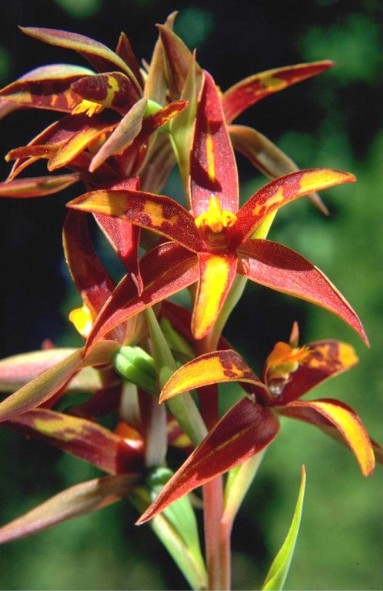 Found in Western Australia at elevations of 100 to 350 meters on low laterite hills and Jarrah Forests as a small sized, cold growing terrestrial orchid with a single broad leaf that blooms in the spring on an erect, 6 to 10 " [15 to 25 cm] long, 2 to 12 flowered inflorescence with several small bracts and often crowded flowers