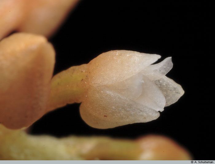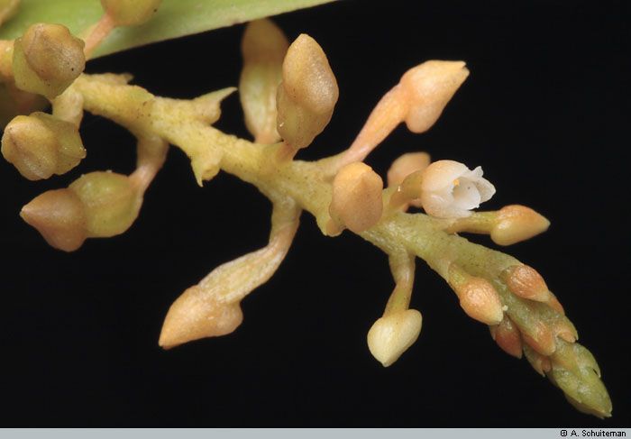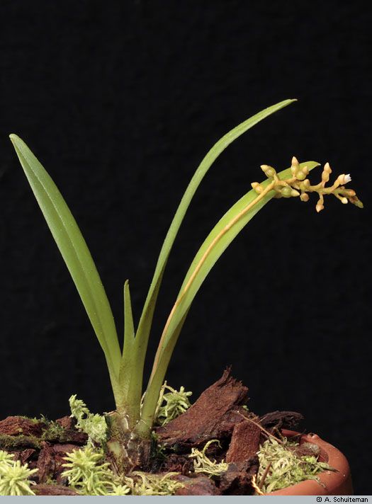 Found in New Guinea in primary and secondary forests at elevations of 25 to 1450 meters as a miniature sized, hot to warm growing epiphyte with a very short, erect stem carrying 6 to 8, distichous, erect-patent, linear-oblong, unequally bilobulte apically, glabrous, sub-coriaceous, attached to the clasping leaf sheaths below leaves that blooms at any time of the year on an erect, to 2.8" [to 7 cm] long, laxly 5 to 15 flowered inflorescence with 3 to 4 small, distant, acuminate, peduncle scales and ovate-lanceolate, acuminate, minute, much shorter than the ovary floral bracts and carrying non-resupinate, patent to pendant flowers.