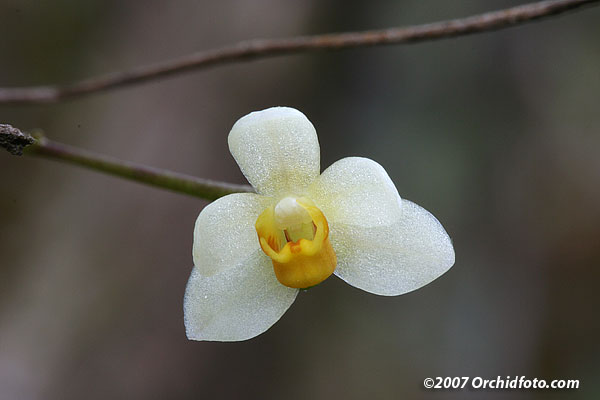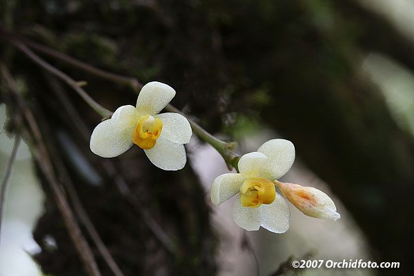 Found in Thailand and Vietnam at elevations around 1300 to 1400 meters as a mini-miniature sized, cool growing epiphyte with a short, monopodial stem carrying elliptic to linear-elliptic, unequally bilobed apically leaves that blooms in the spring on a basal, .6" [1.5 cm] long, successively single, few flowered inflorescence