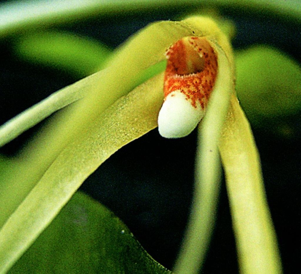 Found in Kalimantan Borneo on riverside trees at elevations of 50 to 150 meters as a medium sized, hot growing epiphyte with spreading, basally branching, leafy stems enveloped by slightly compressed, green, persistent, longer than the internodes sheaths and carrying spreading, linear, tapering at both ends, green, obtuse, subequally bilobed leaves that blooms in the spring, summer and fall on several active at one time, from the nodes at mid stem, 2 to 6" [5 to 15 cm] or more overall , peduncle 1.6 to 5.6" [4 to 14 cm] long, cylindrical, broadening and becoming slightly compressed before the rachis, provided with 2 basal scales and 3 to 5 more distant ones along the length, green, rachis compressed, sporadically successive, 1 to 2, several flowered inflorescence with rather close, compressed, parabolic-triangular, falcate, acute, much shorter than the ovary floral bracts and carrying ephemeral flowers.