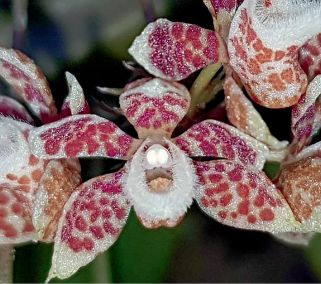Found in the Philippines on Mindanao Island on mossy branches at elevations around 1200 meters as a mini-miniature sized, cool growing epiphyte with flattened, glabrous stems enveloped by cataphyls and carrying lanceolate, apex emarginate, sessile base leaves that blooms in the late winter and early spring on an axillary, cylindrical, erect, peduncle terete, erect, glabrous, 4.68" [11.7 cm] long, provided with 3, triangular bracts, at each internode arise a successive single flower, with up to 4 flowers open at any one time, several flowered inflorescence with aristate, whorled, stout, glabrous, almost as long as the ovary floral bracts and carrying short-lived flowers