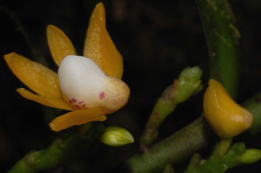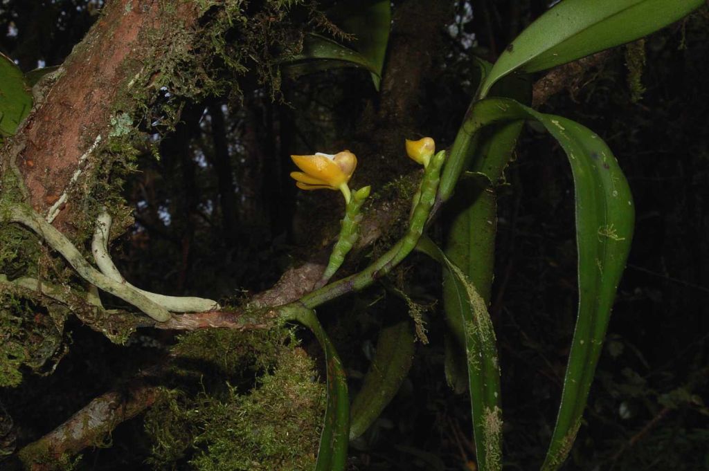Found in penninsular Malaysia and Sumatra in montane forests at elevations around 1600 to 2200 meters as a medium sized, cool to cold growing epiphyte with a sometimes branching, rigid stem carrying short, oblong to strap-shaped, more or less equally and obtusely bilobed apically, reddish and shiny, narrowing below into the tubular sheathed leaves that blooms in the winter and spring on 2 to 3, superposed, 3.2 to 4" [8 to 10 cm] long, longer than the leaves, zig-zagged, quadrangular, laxly successively many flowered inflorescence with three, short, tubular bracts and alternating in 2 rows, short, somewhat clasping the rachis, triangular floral bracts.