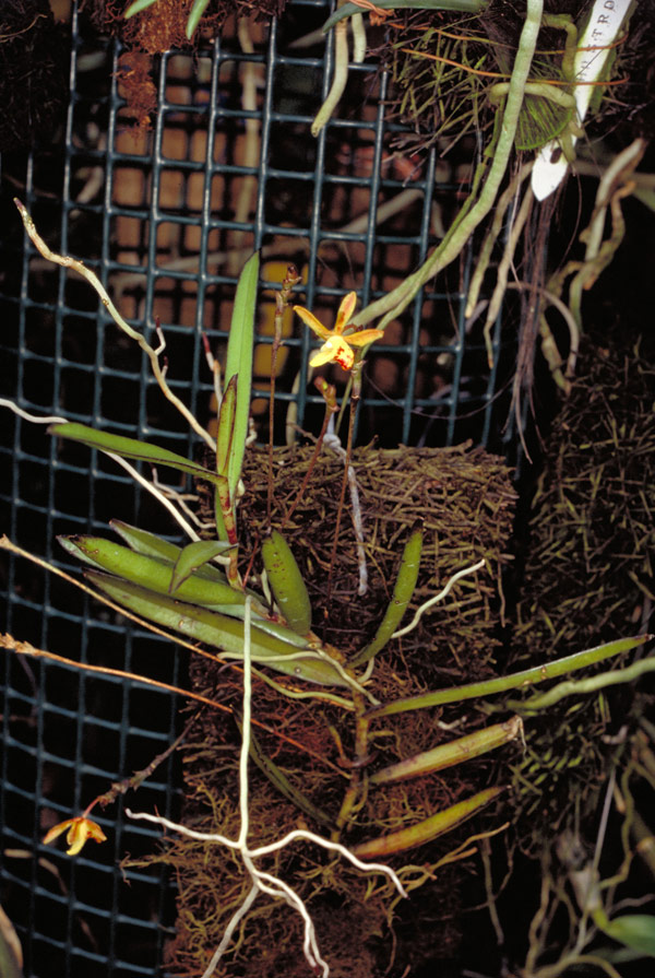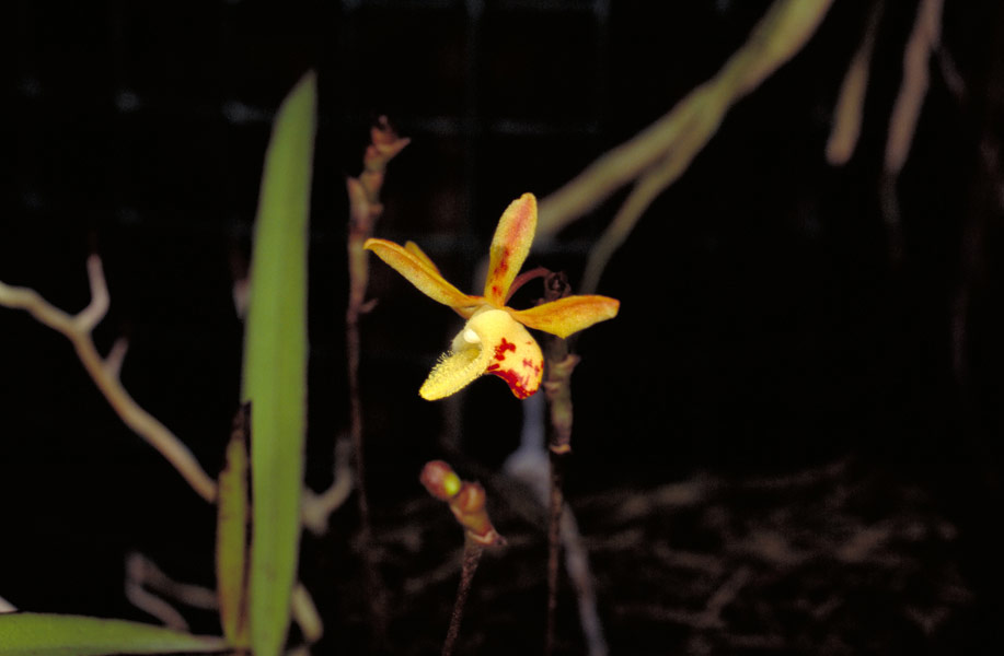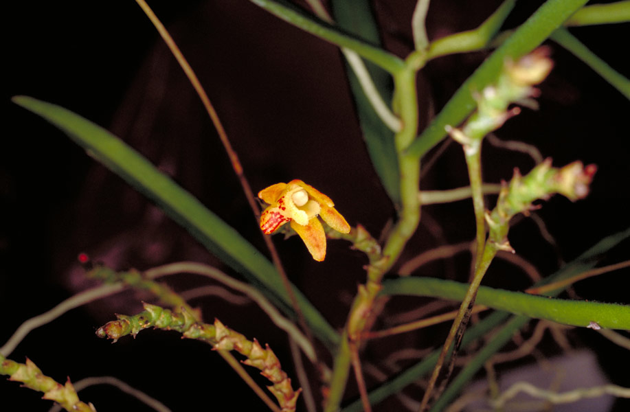 Found in Kalimantan and Sabah Borneo in mossy hill forests at elevations around 158 to 450 meters as a miniature to small sized, hot growing epiphyte with spreading, scrambling, branching stems carrying linear to narrowly elliptic, thick, stiff, green to red, often suffused with dark purple, brown or dark red, acute, sometimes minutely bilobed leaves that blooms at most any time of the year on several, arising from anywhere on the stem, sometimes superposed, peduncle .08 to 6.8" [2 to 17 cm] long, slender, wiry, broadening below the rachis, rachis to 1" [2.5 cm] long, swollen, sporadically single flowered inflorescence with crowded, basally clasping rachis, ovedrlapping, ovate-triangular, keeled, free section falcate, conduplicateshorter than the ovvary floral bracts and carrying ephemeral, often non-resupinate, sometimes lemon scented flowers