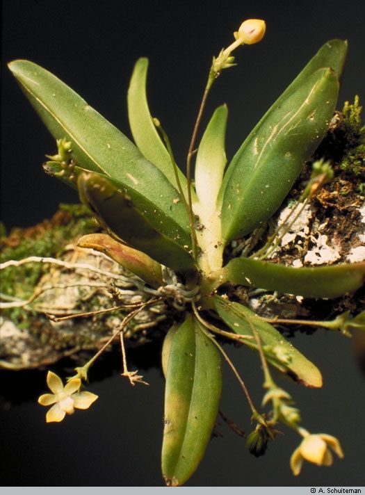 Found in New Guinea, Solomon Islands, Northern Territories and Queensland Australia, New Caledonia and Vanuatu in lowland forests at elevations of 10 to 450 meters as a small sized, hot growing epiphyte with an elongate, terete, rather rigid stem enveloped by striate, leaf-bearing sheaths and carrying ligulate, obliquely and obtusely bilobulate leaves that blooms in the winter and summer on an erect-patent, 5.4 to 8.8" [14 to 22 cm] long, densely several flowered inflorescence with lanceolate-subulate floral bracts that are shorter than the ovaries and carrying successively opening flowers
